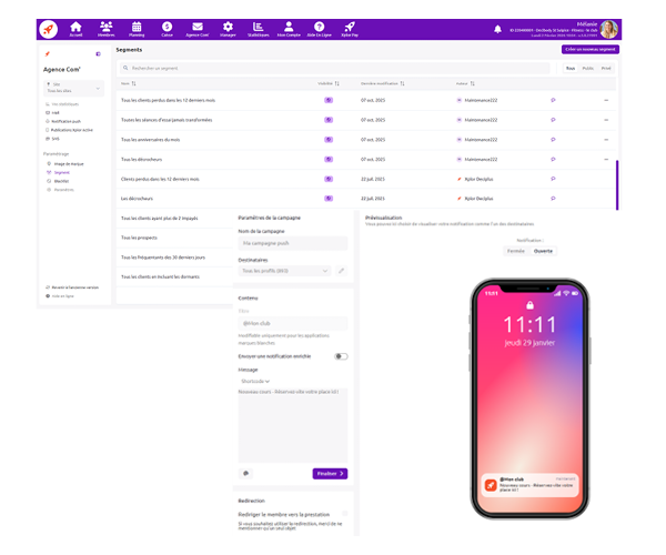 - Communiquez sur tous les canaux : emails, SMS, notifications push et publications in-app
